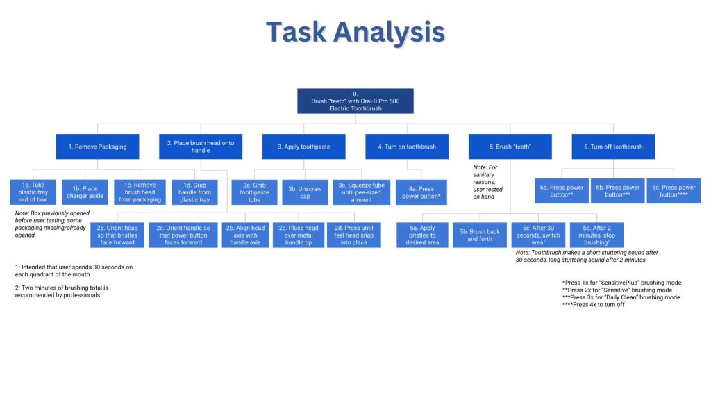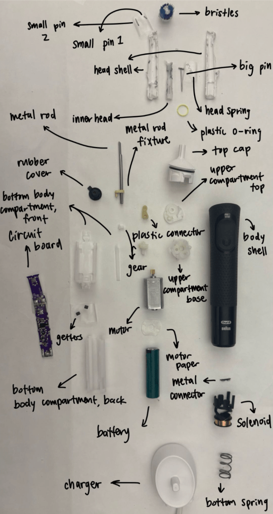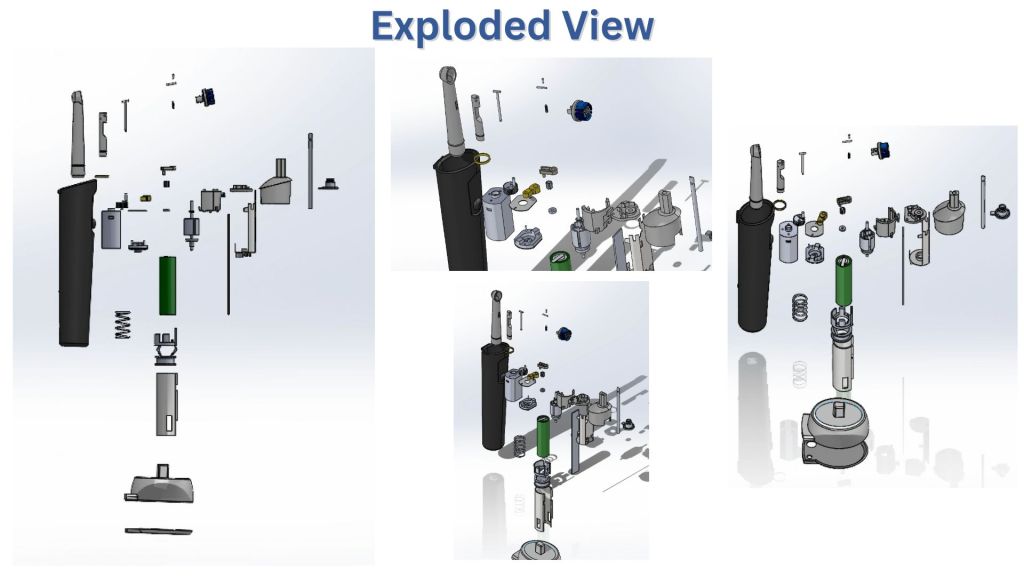 Group project: full product analysis of Oral-B electric toothbrush with user testing, task analysis, and exploded views, both physical and virtual (modeled in SOLIDWORKS).